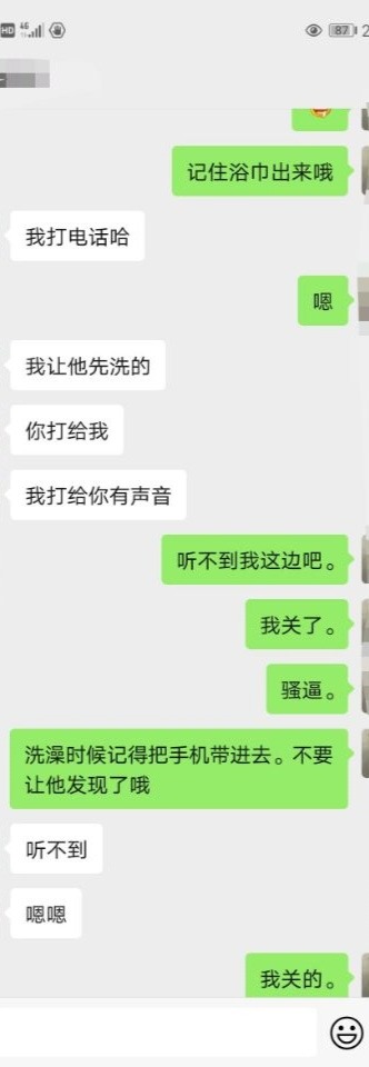 大概两分钟左右,听到妻子进门了。前隐约听到问妻吃饭了没,之类寒叙。(此时心想这家伙怎么不开始) 大致过了十几分钟,听到两个人接吻的声音。再之后就是妻说她去洗澡。然后半天没声音,片刻妻出来说道你也去洗。。。。此时妻小声的对着电话说,她放床头听得到吗?我回答恩!!!